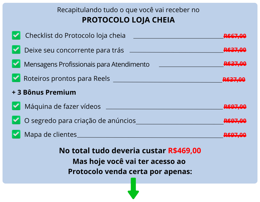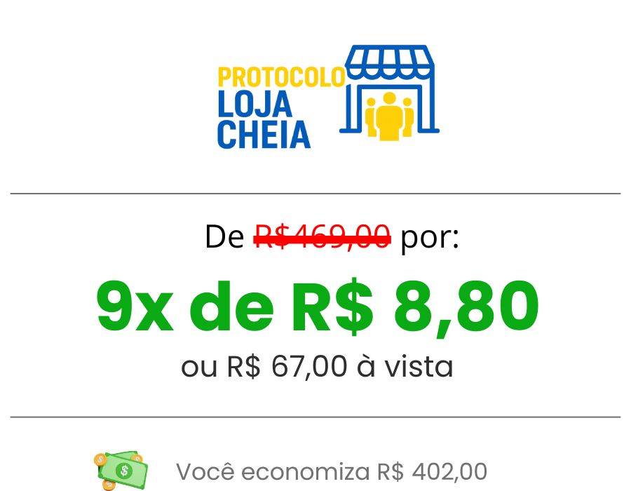 Você adquire agora o acesso completo ao PROTOCOLO LOJA CHEIA pela condição especial de R$67,00 e tem 7 dias