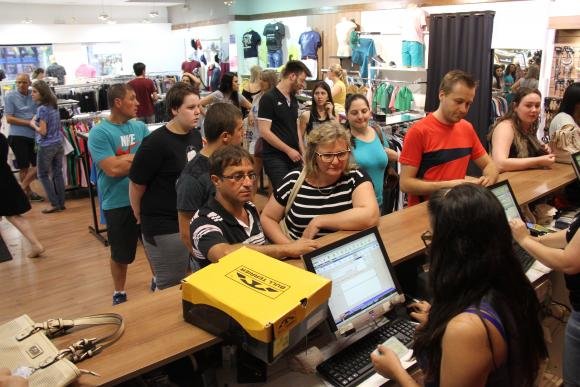 Ninguém entra. Funcionários parados, esperando clientes.